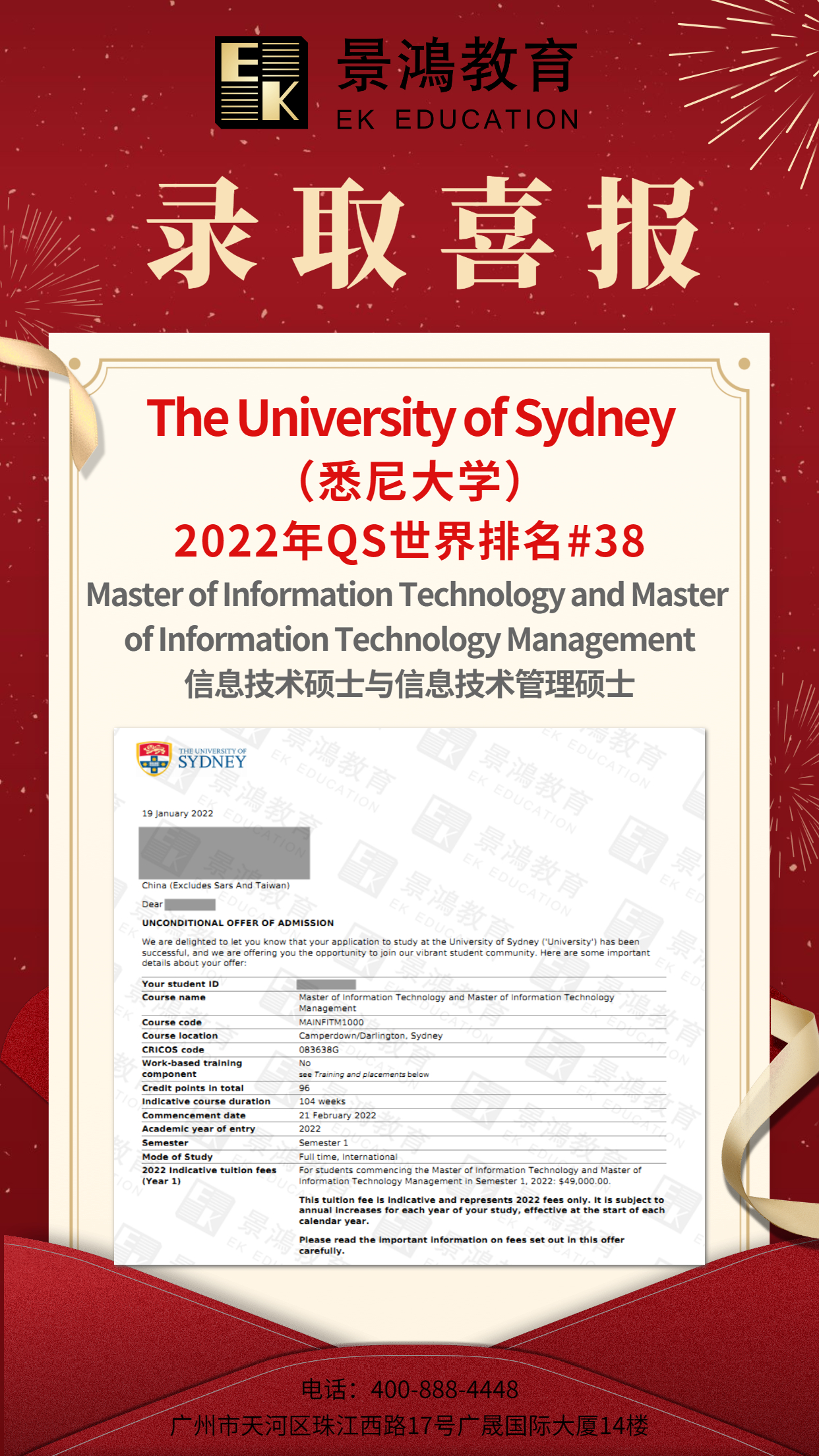 恭喜M同学获悉尼大学硕士录取!