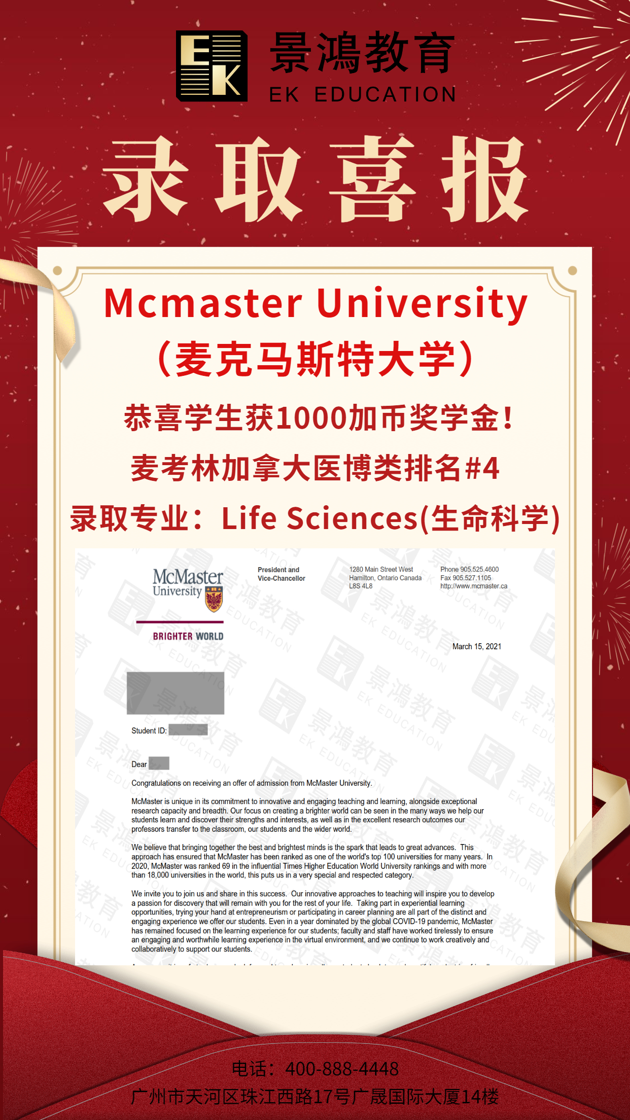 恭喜K同学获麦克马斯特大学本科录取,