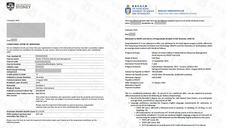 在后续阶段,景鸿团队持续关注M同学的学业进展,提醒她保持本科成绩,并鼓励她尽快考出合格的雅思成绩。最终,M同学在12月底成功取得6.5分,并于2025年1月3日获得香港科技大学Master of Science in Global Marine Resources Management专业的有条件录取,只需在2025年7月补充本科学位证等材料即可正式入学。