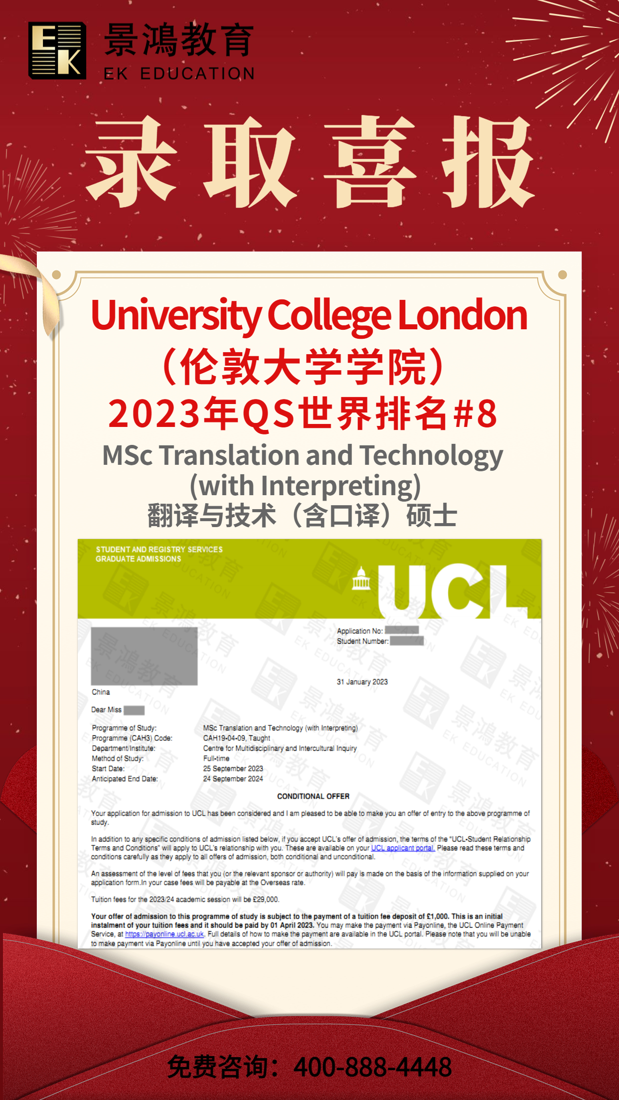 内容提要:恭喜F同学获伦敦大学学院硕士录取! 学 生背景 学历:国内本科,应用翻译专业 GPA:3.64/4.0 雅思:7.5 伦敦大学学院 伦敦大学学院简称UCL,建校于1826年,是英国规模最大、学科最广的
