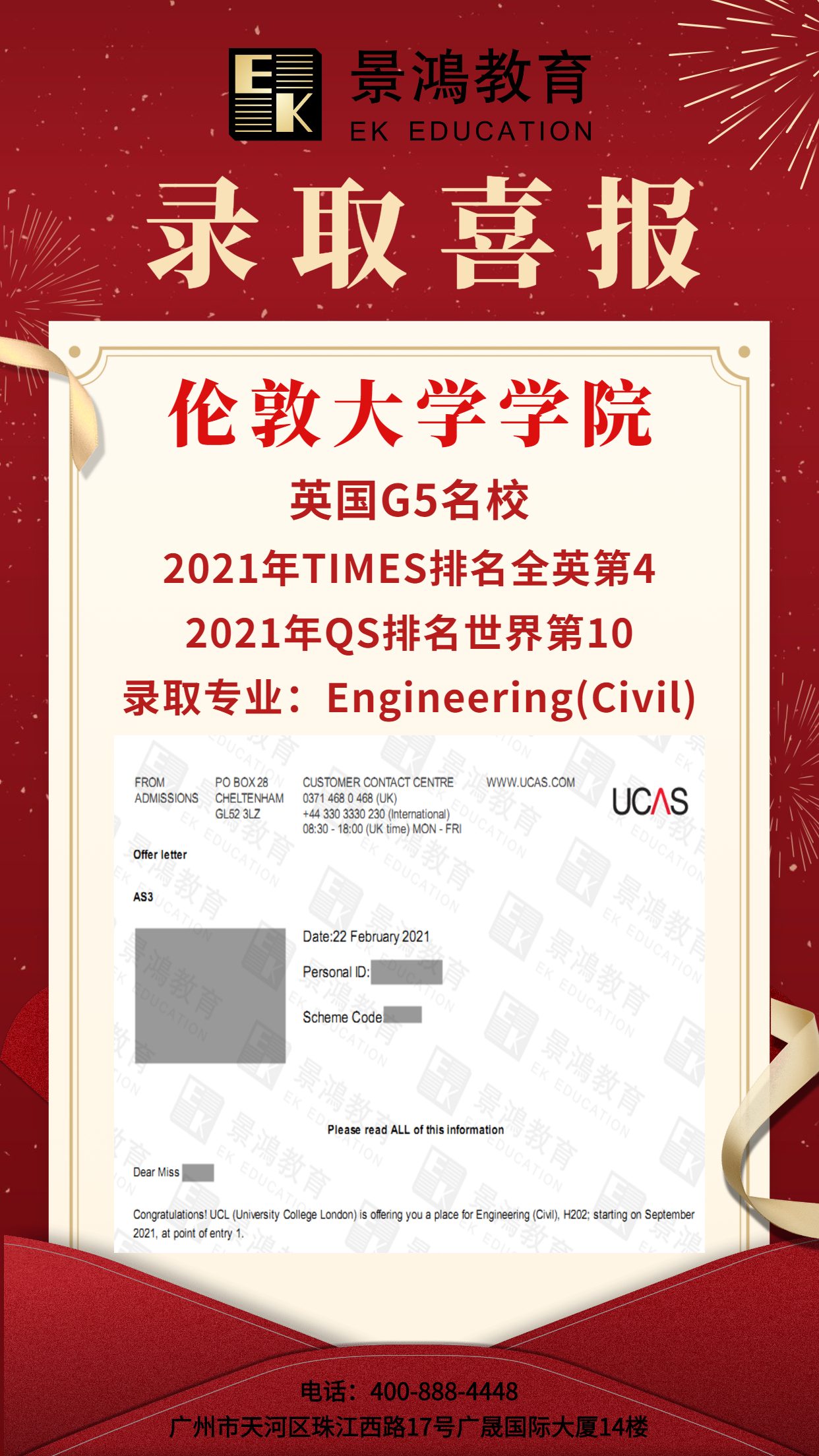 内容提要:新春开门红, 景鸿喜报多多! G5名校offer来了! 恭喜F同学获伦敦大学学院本科录取! 学生简介 学历:加拿大高中 GPA:90+ 雅思:6.5 景鸿教育协助:F同学学习刻苦,做事认真负责,也