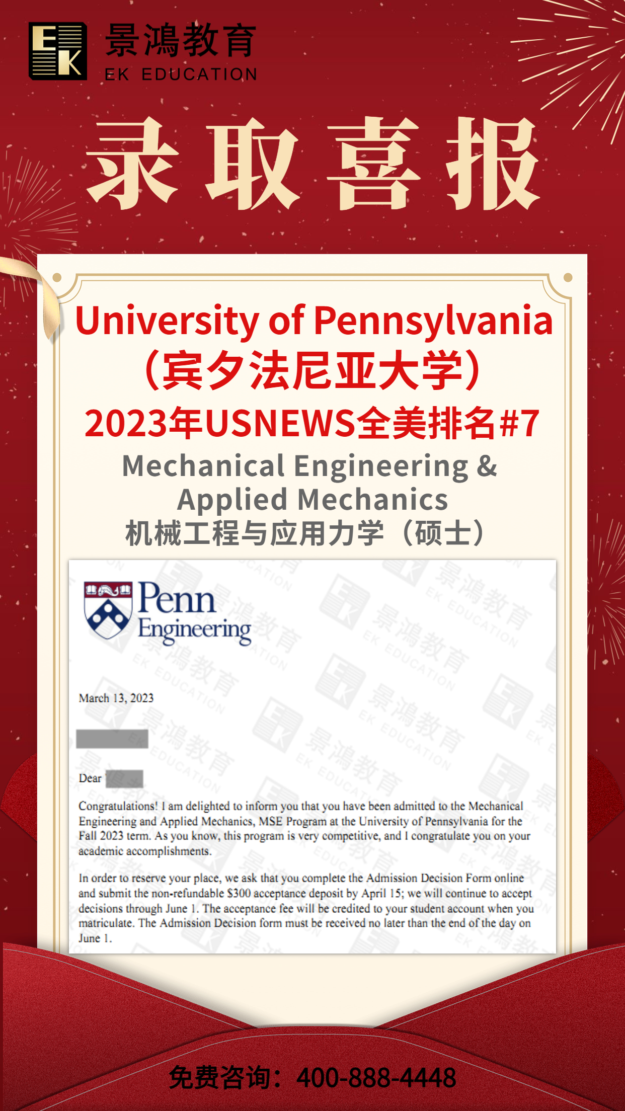 恭喜Y同学获美国常春藤名校宾夕法尼亚大学硕士录取!
