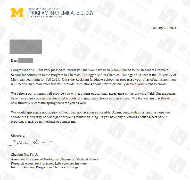 另外,景鸿专业顾问及资深文案团队除了帮助W同学规划详细的申请方案与优秀文书,还详细分析背景提升规划,根据其要申请的心仪专业-Cancer in Chemical Biology,推荐了适合W同学的高端科研项目——美国布朗大学终身教授Arthur Salomon【癌症的分子基础,环境毒物和中药的研究】。W同学进入该项目学习并顺利完成,获得了美国布朗大学教授的高度评价,项目成绩报告、论文发表以及布朗大学教授的推荐信,成功助力高难度的研究型硕士申请,拿下密歇根大学安娜堡分校录取!